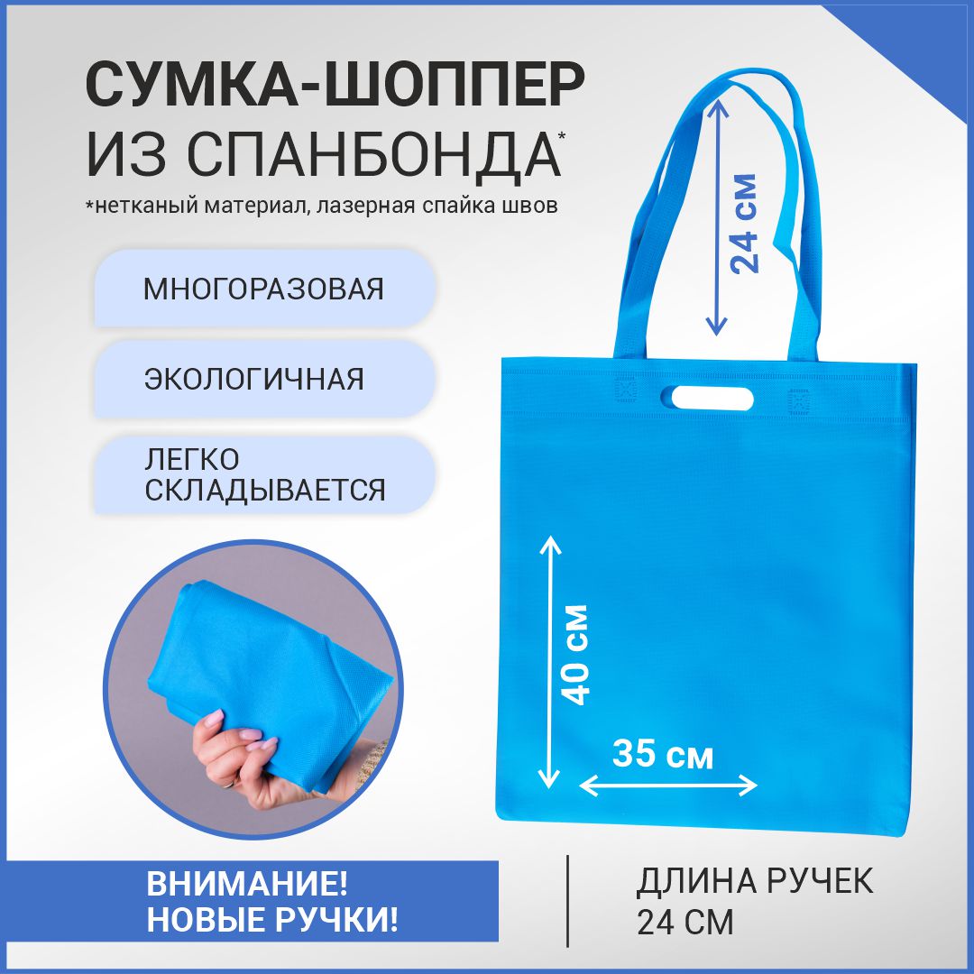 —Сумка-шоппер из спанбонда с пришивными ручками 24 см, синяя, 35 х 40 см