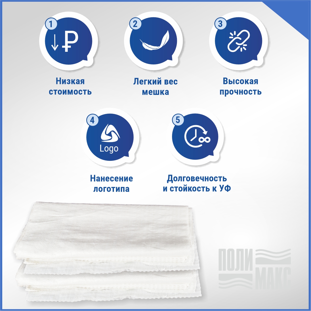 Компания «Полимакс» предлагает белые мешки из первичного полиэтилена размером 55×105 см и вместимостью до 50 кг. Плотное плетение обеспечит сохранность содержимого. Ткань воздухопроницаема, поэтому пищевая продукция сохраняет свое качество. Посторонний запах отсутствует.
